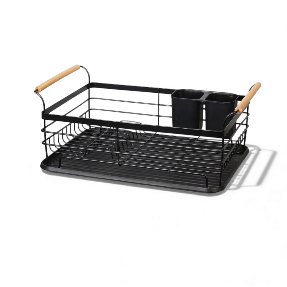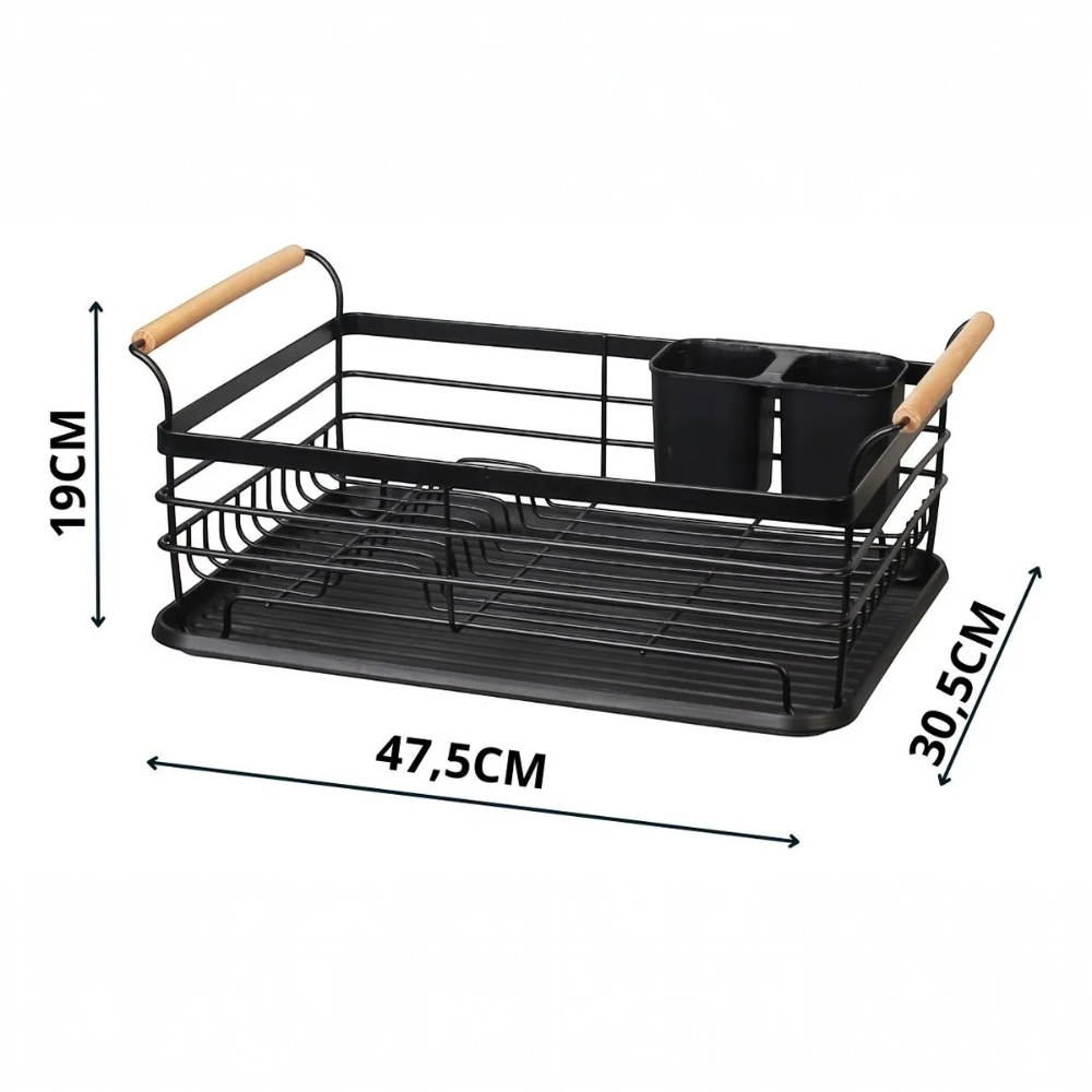Elegí diseño y funcionalidad para tu cocina con este elegante escurridor cuadrado negro con mango de madera. Ideal para organizar y secar tu vajilla con estilo, aportando un toque moderno y minimalista al ambiente.