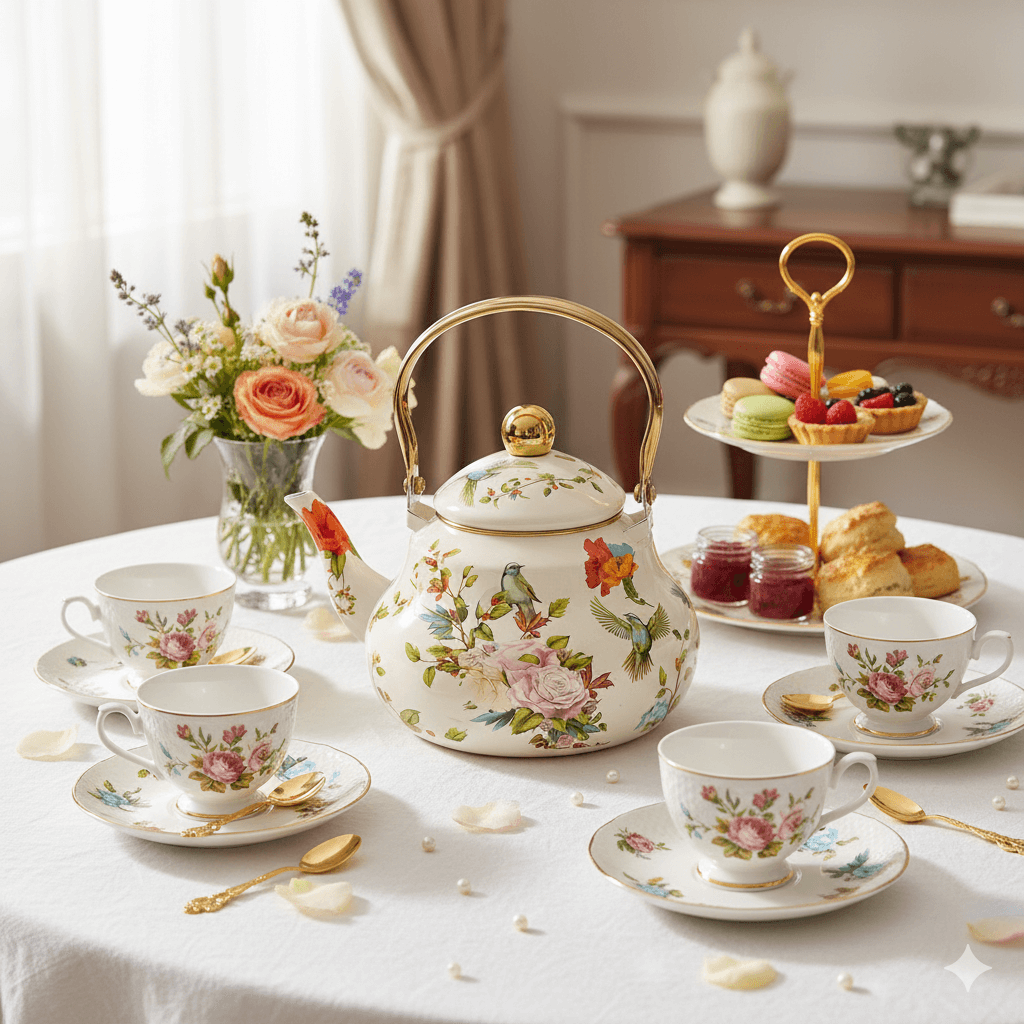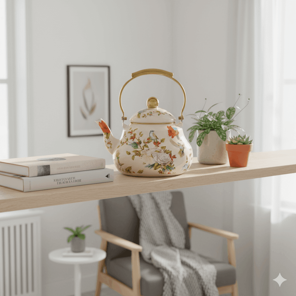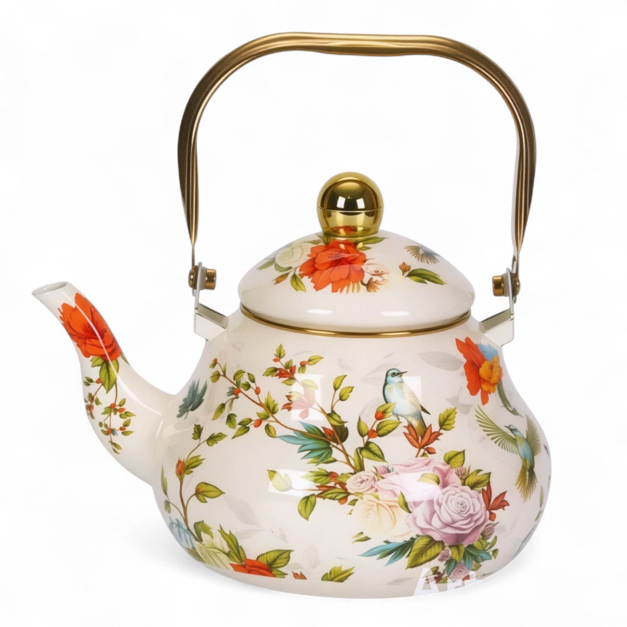 Dale un toque de elegancia y color a tu cocina con esta pava enlozada con diseño floral y detalles dorados, inspirada en la naturaleza y el estilo clásico vintage.