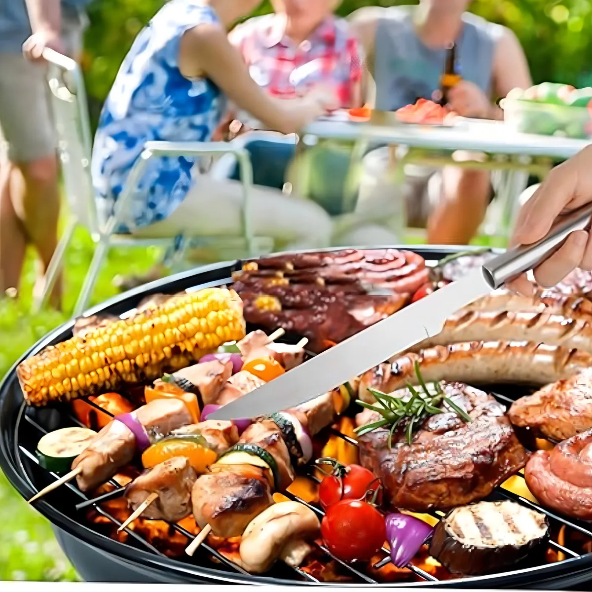 Incluye espátula, tenedor, cuchillo y pinza largos (≈34 cm) para cocinar cómodo y seguro en la parrilla.