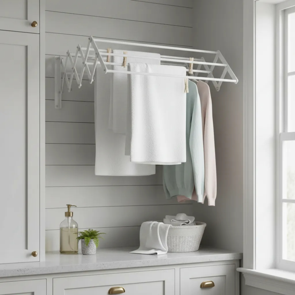 El Tender Extensible de Pared Acordeón es la solución perfecta para aprovechar al máximo el espacio en tu hogar. Diseñado con acero duradero, este perchero es ideal para secar ropa y toallas de manera eficiente.